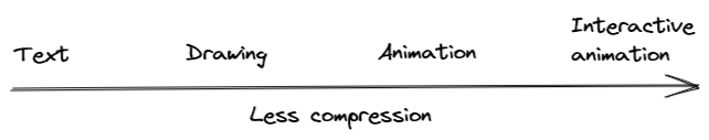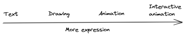 Consider a simple example. “The boy threw a ball.” In text that’s five words. It can be written in seconds and read even faster. If this same idea is expressed as an interactive animation, it’d take days of manhours and years of experience to make, and minutes to experience.